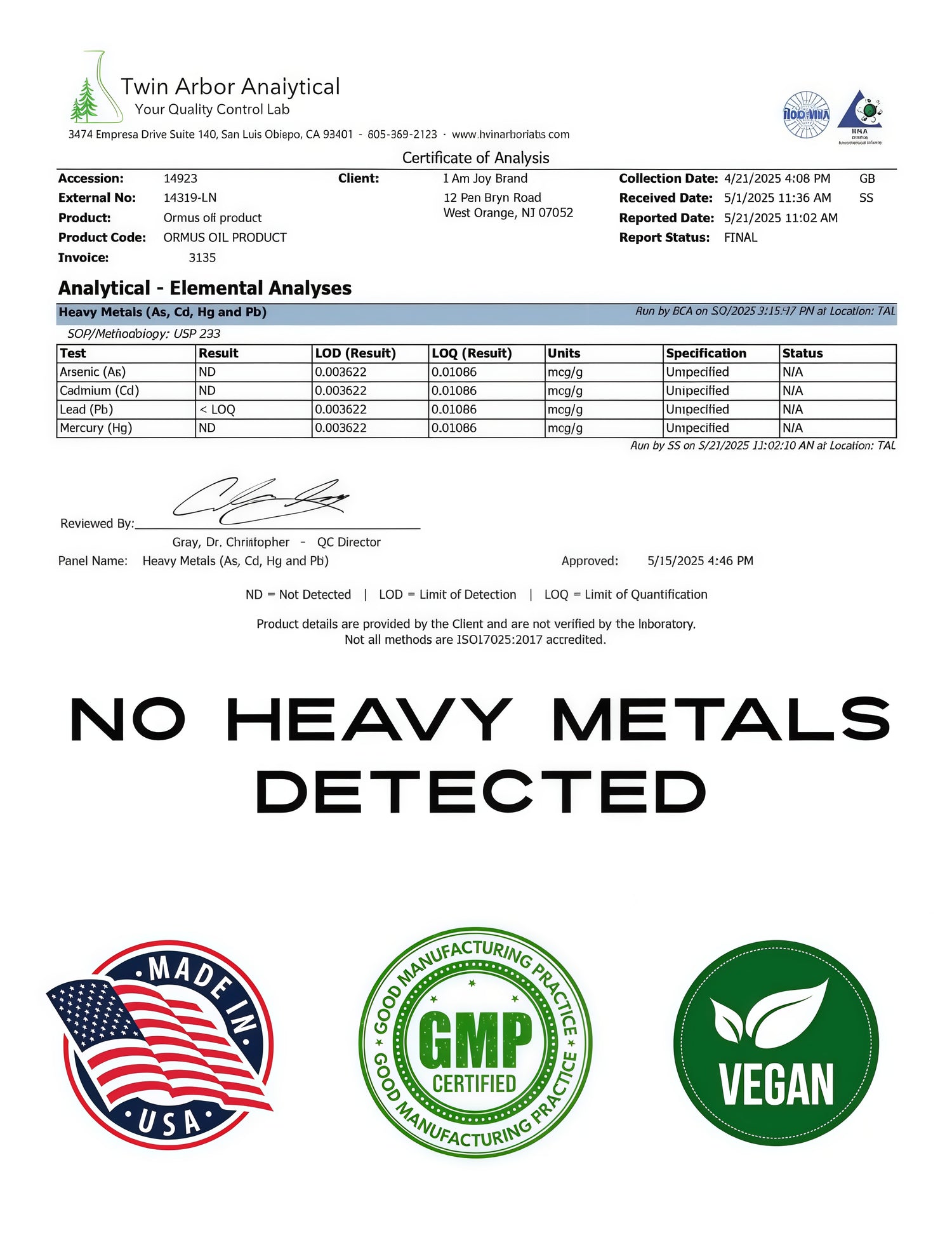 I Am Joy sets the standard for transparency in ORMUS supplements. Our products are third-party lab tested in the USA, and we’re among the few companies that publicly share our Certificate of Analysis, proving our ORMUS is free from heavy metals. We value trust, transparency, and long-term relationships with our customers by delivering products that are truly safe and effective.
